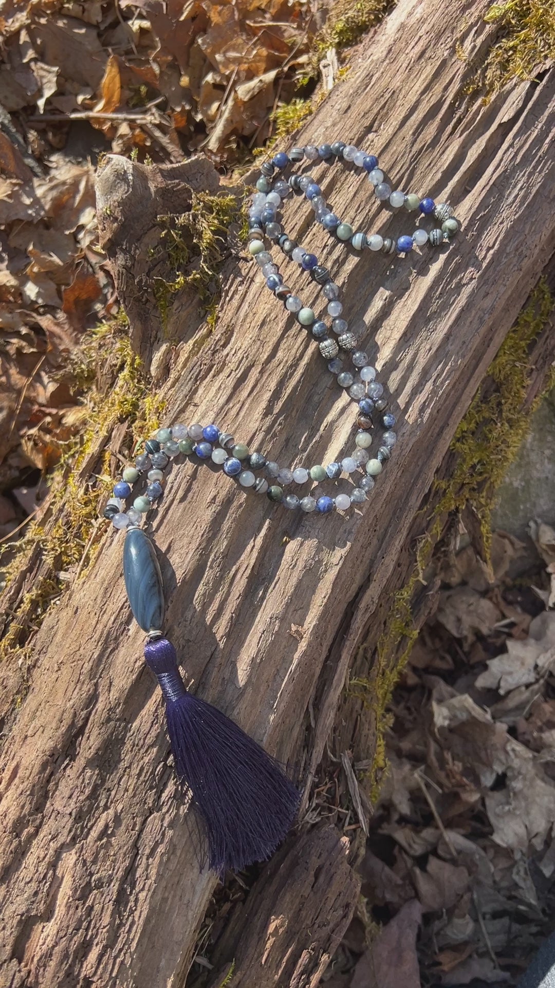 - 108 hand-knotted gemstone beads: 6mm Iolite, Sodalite, Eagle Eye & Sardonyx
