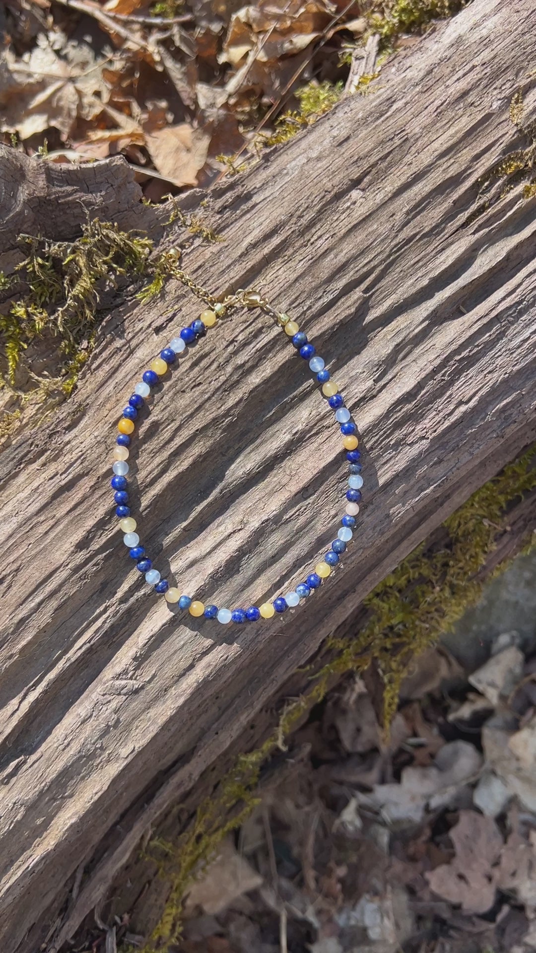 Is it just me or do the colors of the summer sky seem more vibrant than in other seasons? This anklet is made with high-quality Lapis Lazuli, Yellow Jade, and Blue Chalcedony stones and were chosen to represent those gorgeous sunny days when anything seems possible.